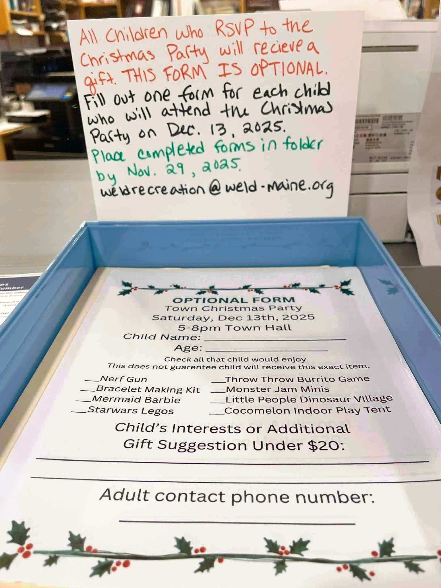 The Weld Recreation Committee continues to collect optional gift suggestion forms for children who will attend the Town Christmas Party. If you are coming to the party please RSVP to ensure we have enough gifts for all the children. You can RSVP by sending an email to weldrecreation@weld-maine.org or by filling out an optional gift suggestion form. Forms can be found at the Weld Town Office (23 Mill Street) Weld Public Library (25 Church Street) or Skoolhouse Variety Store (32 School Street).